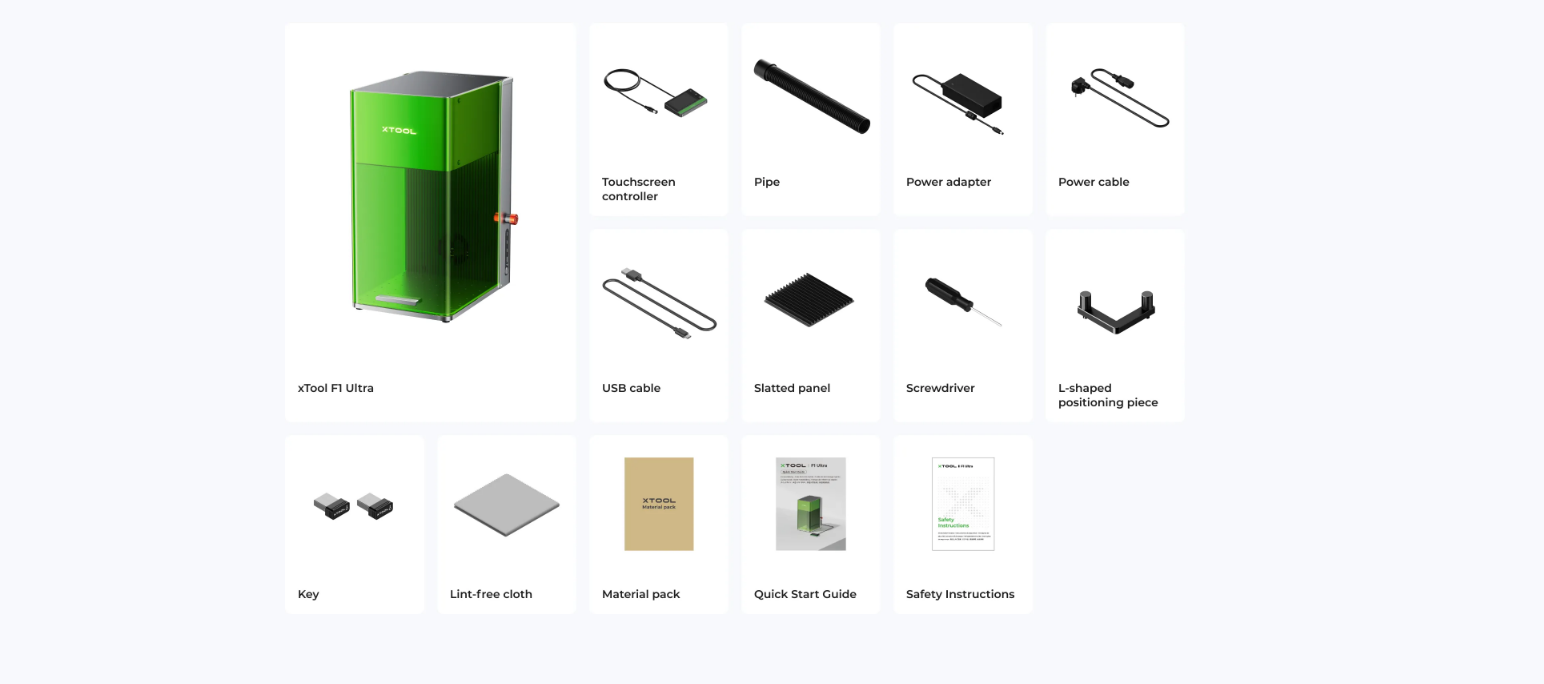 | Main Unit | xTool F1 Ultra | The primary machine unit, featuring a distinctive green and black casing. |
